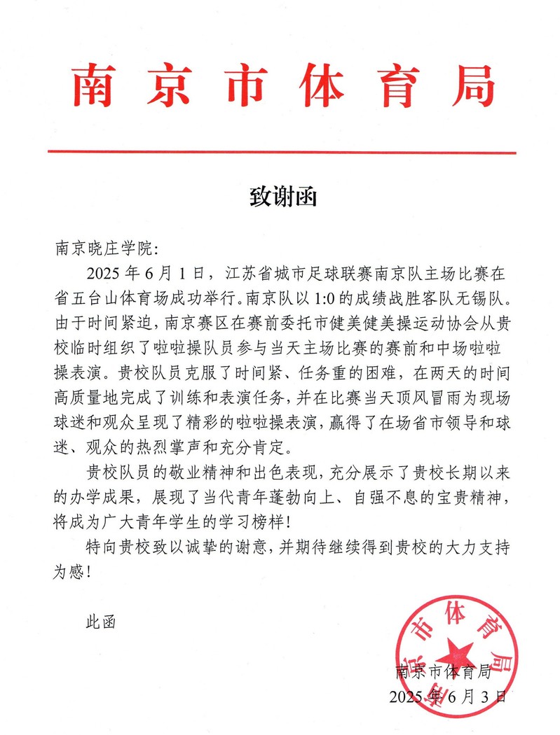 近日,我校收到南京市体育局的致谢函,感谢学校大力支持江苏省城市足球联赛南京队主场比赛中的啦啦操表演,充分肯定了我校啦啦操队员的敬业精神和出色表现。
